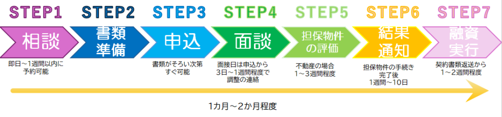 担保融資の場合、無担保融資の審査期間(平均1カ月)に加えて、担保物件の評価が必要になります。