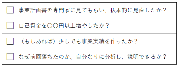 なぜなら、再申請までの期間に事業のために資金を準備してきた姿勢を示すことで、事業への本気度を伝えられるからです。