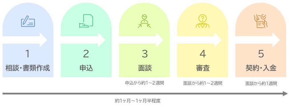 | 審査期間 | 1~1か月半 | 1~2か月 | 1~2か月 | 1~2か月 | 1~2か月 |
