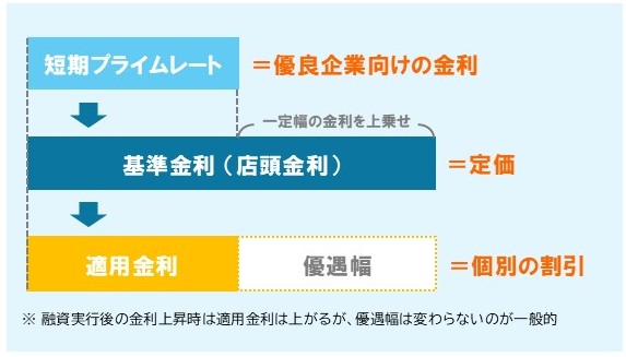 では、基準金利はどのようにして決まるのでしょうか?基準金利には変動金利と固定金利がありますが、仕組みは同じです。変動金利は、各金融機関が返済能力を高く評価する優良企業に対し、期間1年未満で融資をする際の金利である短期プライムレートに、一定幅の金利を上乗せして決められています。