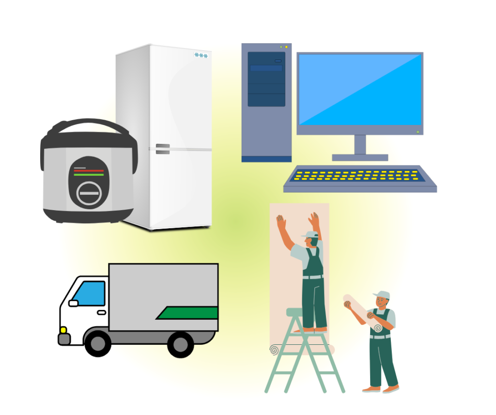 | 機械・備品 | 機械設備、業務用車両、パソコン、什器(机・椅子・電話など) |