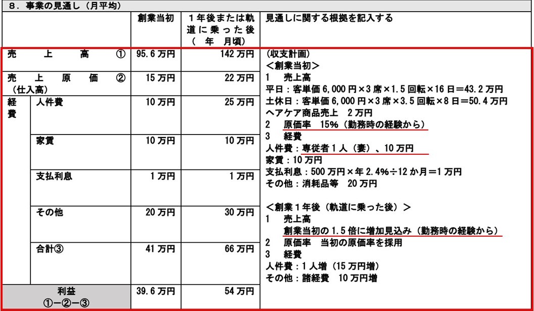 | <OK例> 平日・休日の売上予測が詳細で、原価率や人件費、軌道に乗った後の売上高の根拠も書かれており、説得力がある。 ![]() |